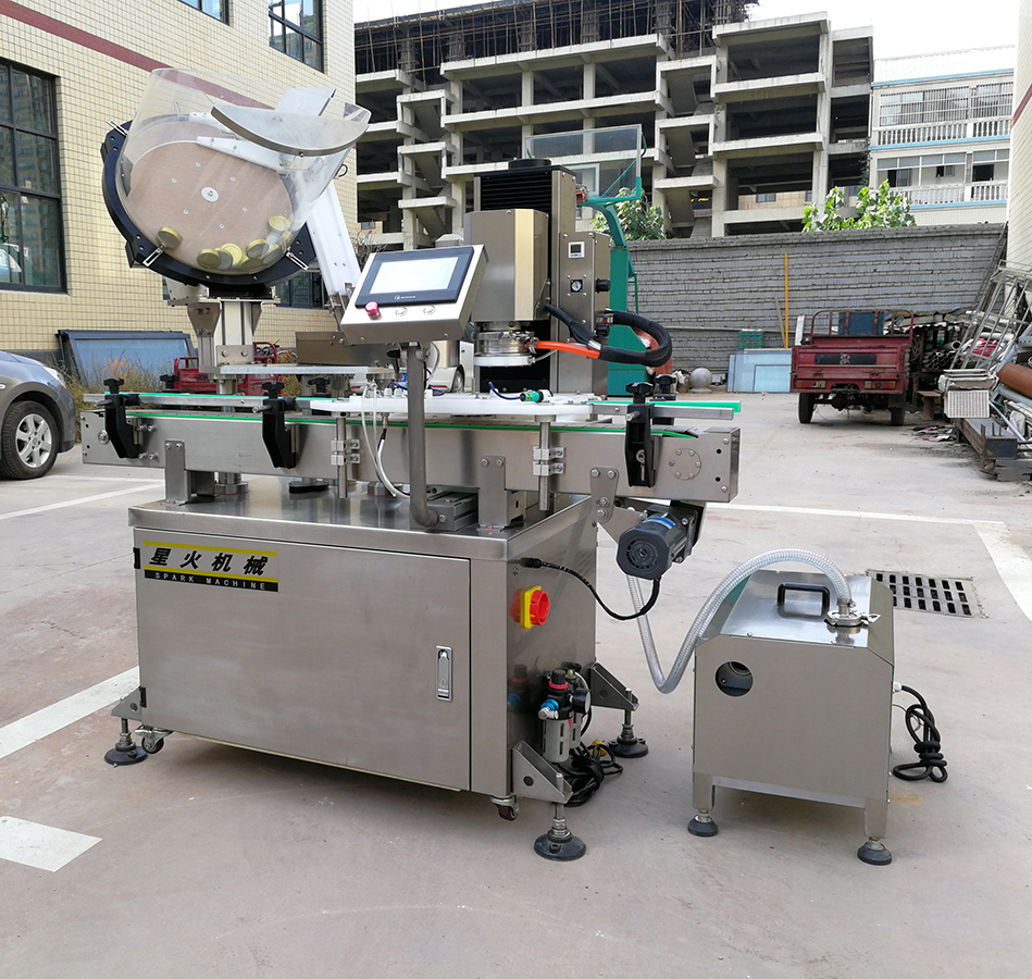 是玻璃瓶馬口鐵瓶旋緊瓶蓋的專用自動化真空旋蓋設備,該醬料玻璃瓶真空旋蓋機包括:進出罐輸送、進罐器、配蓋器、真空室、旋蓋頭等主要部件,設備采用304不銹鋼制作,外形美觀,結構考究,PLC電子光纖傳感控制,實現自動進出罐、自動配蓋、抽真空、夾緊瓶身、旋蓋等動作,多應用在醬料瓶、罐頭及保健食品行業,采用氣動和電氣編程控制取代機械傳動裝置帶來的好處是:設備可以很干凈,避免潤滑油脂對生產環境和產品的影響,很重要的是,可以對產品需達到的指標參數進行監控和靈活調整,如真空度、擰蓋力矩等。氣動裝置,運行靈活方便,大大提升了企業的工作效率。
