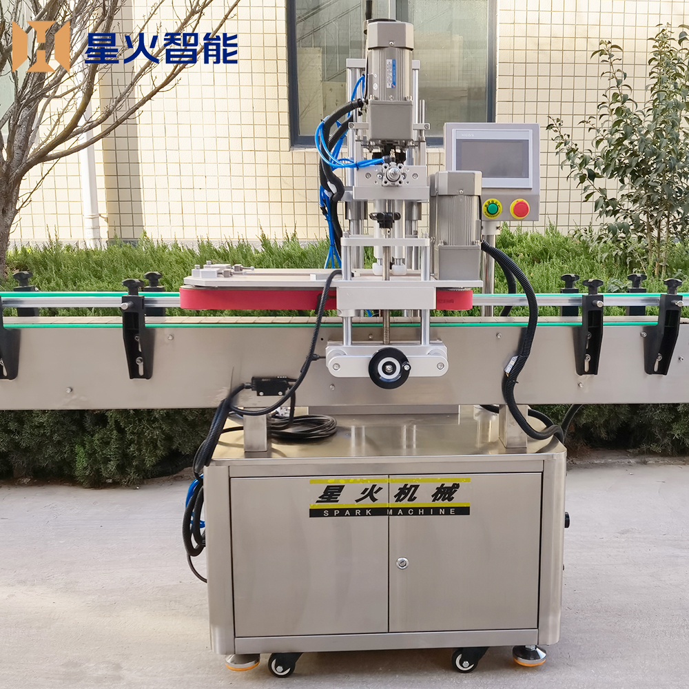 全自動夾蓋旋蓋機的工作原理是經過PLC控制系統的數據優化后,先通過自動送料系統將所需的蓋子送達到指定位置,然后再由夾蓋裝置對準并開始進入旋蓋工序,全自動夾蓋旋蓋機旋蓋頭會按照工作人員預設的扭矩數值旋轉蓋子,直到達到所需的密封程度。整個工作過程可根據實際情況進行調整。